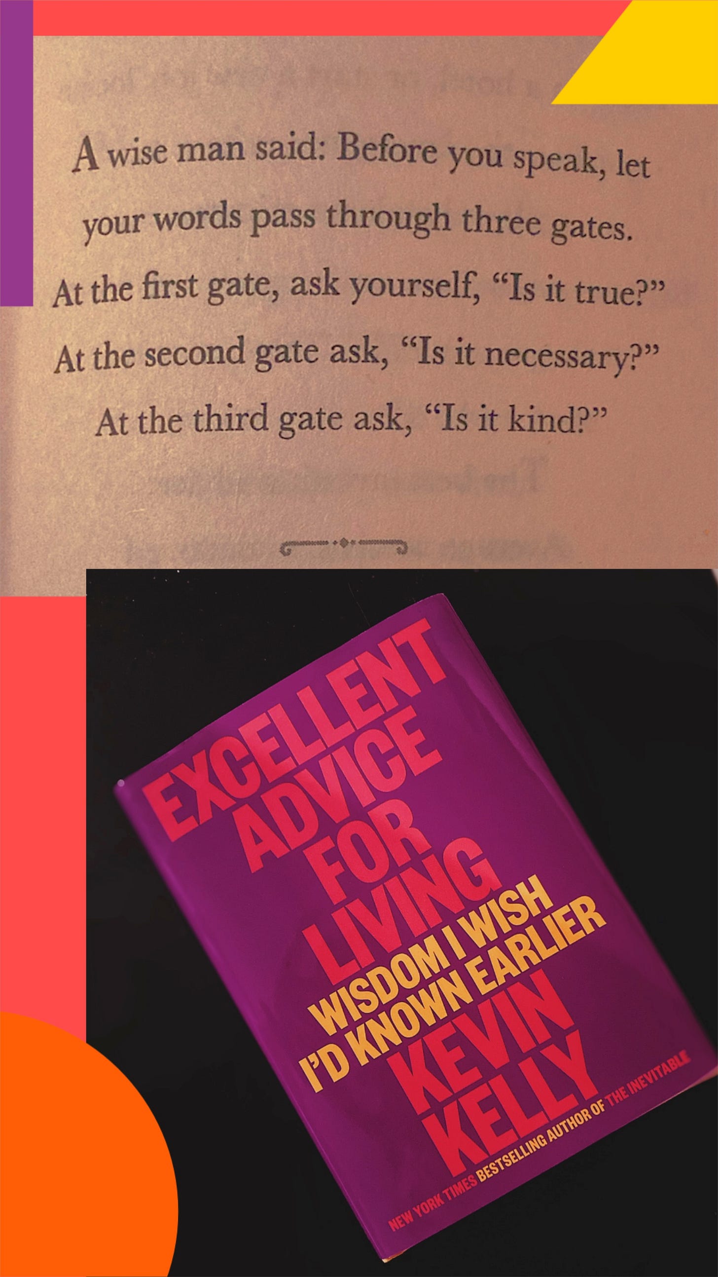 - Excellent Advice for Living - Wisdom I wish I’d Known Earlier by Kevin Kelly: Life-advice books can be a bit cliché. But this book is jam-packed with wisdom, turning it into a night table essential. Kevin Kelly is one of the most interesting people in the world, and the wisdom in this book encourages us to be a bit kinder, bolder, and authentic in all we do. Below is my favorite quote, which I’ve written about before: