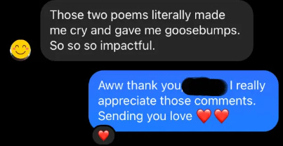 I still struggle with this tension today. Thankfully, an experience a couple of years ago reminded me of the importance of writing and sharing my poetry.