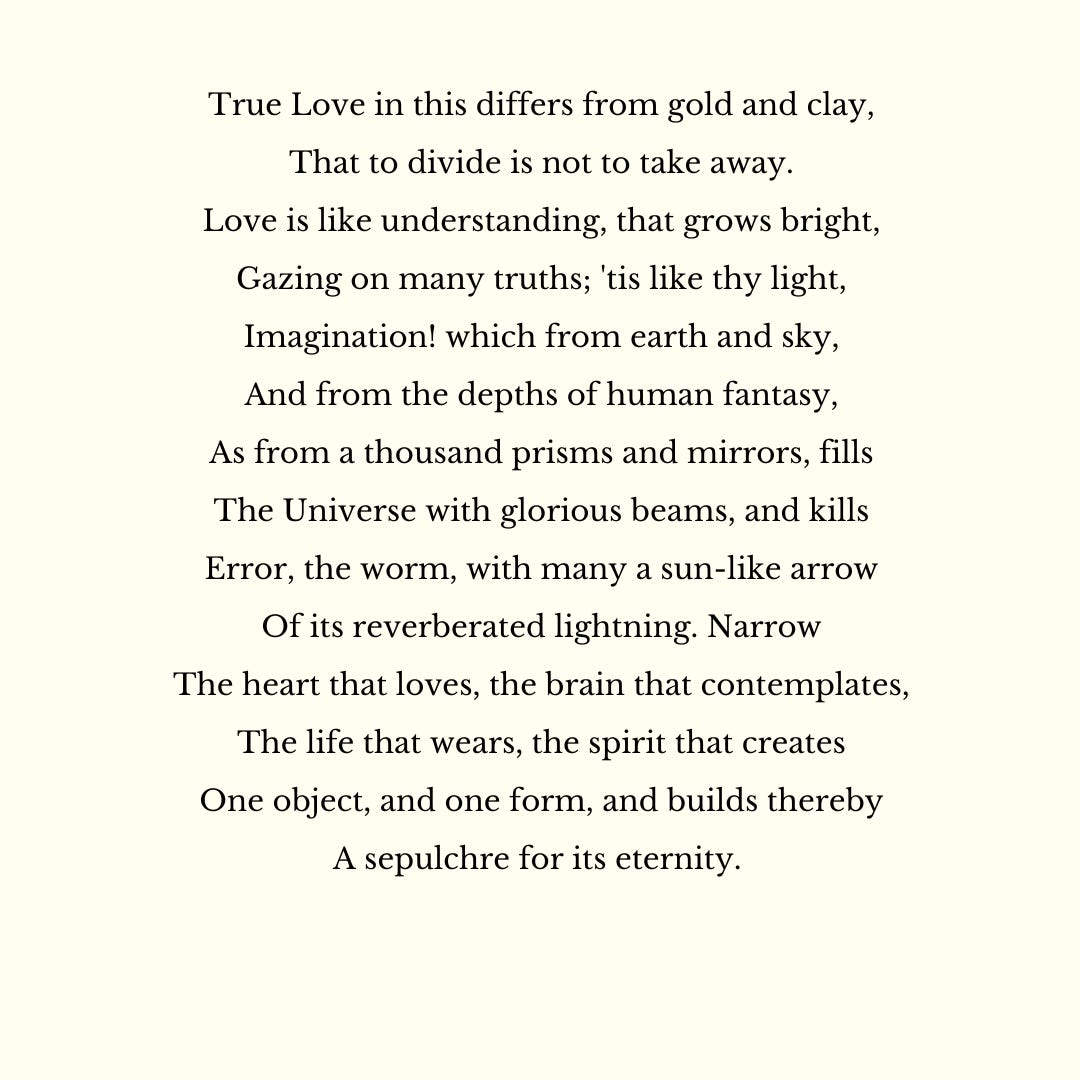 In college I learned about the Romantic English Poets (Lord Byron, William Blake, William Wordsworth, Samuel Taylor Coleridge, Percy B. Shelley, and John Keats). It was one of my favorite classes ever. I learned to break down poems, to see beneath the words and discover the universes living in syllables. I found an affinity with their Romanticism, their yearning to challenge convention and sterilizing rationality. For one of our assignments we were asked to write an essay deconstructing a poem. I chose Percy Bysshe Shelley’s Epipsychidion where I discovered what perhaps is my favorite stanza ever.